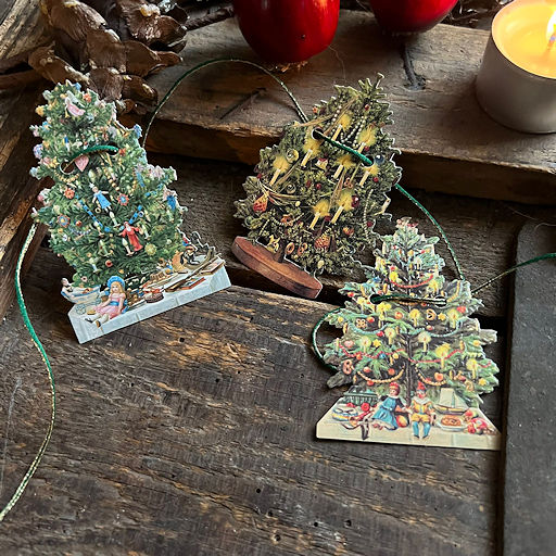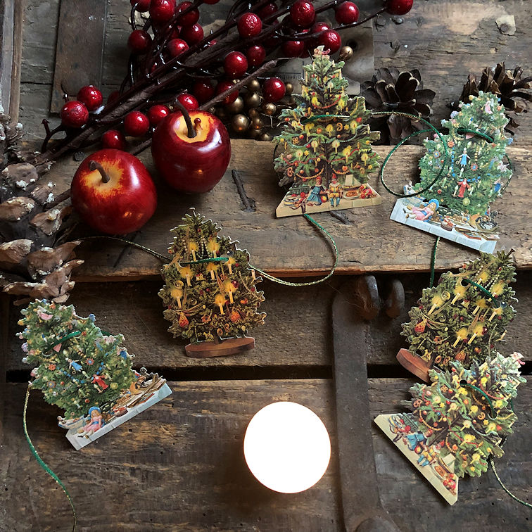 Girlande mit verschiedenen Weihnachtsbaummotiven der Gründerzeit auf Karton, beidseitig bedruckt. Das Band ist 1,20 m lang, die Figuren ca. 7,5 cm groß. Ideal z.B. als Christbaum- oder Wandschmuck oder als Dekoration von Türen und Fenstern.